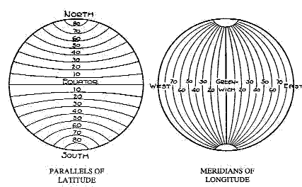 This is accomplished by dividing the Earth from pole to pole by another set of imaginary circles called Meridians of Longitude, shown in the above chart running the North-South axis. They are so called because all places located along such a circle have noon at the same instant, regardless of how far they are from the equator or whether near the north or south pole.