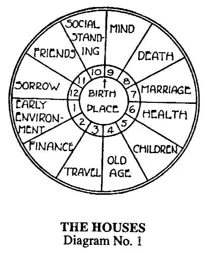 The purpose of the division into signs and houses is to determine the angle of the stellar ray, for upon that depends its influence. In order that you may still better understand the principle, drive one of the needles of your wheel into a block of wood so that it stands upright; place it in front of you, and compare it with the illustration in this self-study module which is marked "The Houses." (Diagram No. 1).