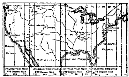 This innovation grew out of the confusion which existed in railroad time-tables before its introduction. Where several railroads entered a city, each had its clocks set to a standard of its own, and in addition, the people in that city had their own local time. Sometimes the clock on one railway station varied half an hour from that of another railroad company, and both pointed to a different time from the timepiece on the city hall. It was therefore suggested that if the country be divided into time zones, each about fifteen degrees of longitude in width (this being the distance the sun travels in one hour), and all the clocks in each division set to one uniform time, gauged by a meridian located in the center of its time zone, the difficulty would be overcome. Accordingly, America was divided into four such zones by three imaginary lines, as illustrated in the diagram: