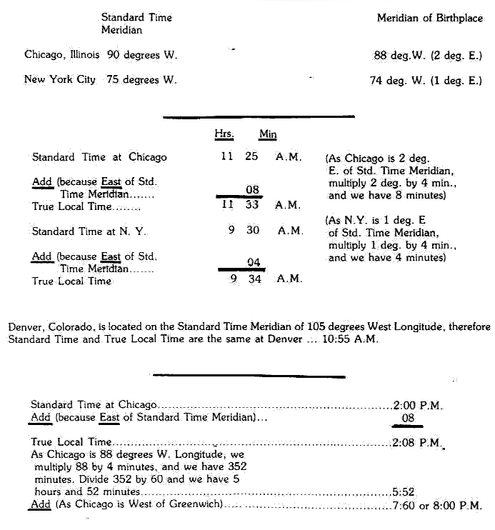 We next calculate the Sidereal Time of a birth occurring at New York, July 23rd, at 9:56 P.M. Standard Time, 10:00 P.M. True Local Time (See Astrology Independent Study Module No. 3). The previous noon is July 23rd, at 12 o'clock, and the Sidereal Time given in the ephemeris for that day is 8 hours, 3 min.. The correction for Longitude of the birthplace is the same as in the previous example, as both are supposed to be born in New York. The interval from previous noon, July 23rd, to 10 P.M., the hour of birth, is 10 hours, and the correction of 10 seconds for each hour of that interval is 100 seconds, or 1 minute, 40 seconds. These figures we tabulate and add: