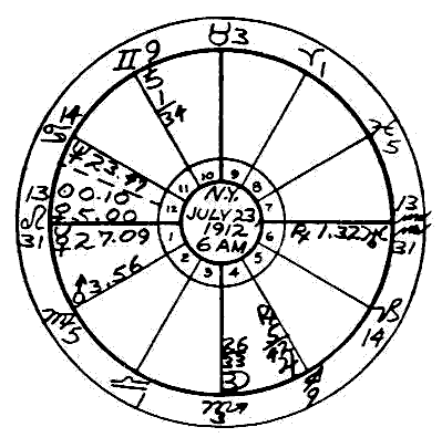 Practice will make you proficient, and after a while you will be able to erect such a simple figure in 10 or 15 minutes, without all the circumstances necessary when learning; but in order to be sure that you understand thoroughly, we will erect another horoscope by easy stages while proceeding to learn the aspects.