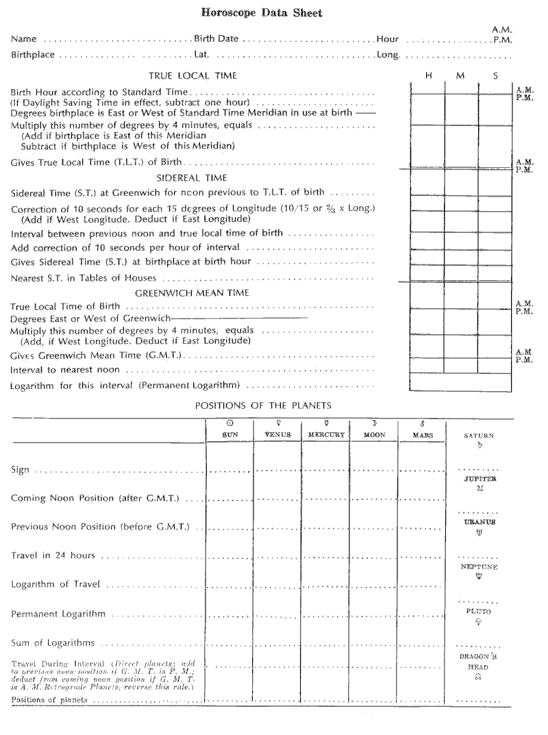 1. In Astrology Independent Study Module No. 9, I asked you to calculate the signs on the cusps of a horoscope for 4 P.M. Standard Time, August 10th, 1912, at New York. Please figure now the places of the planets, insert them in the horoscope and send it to me, that I may see if you remember how to do this work. (Please refer to "Information for Astrology Course" for help with this assignment.) (optional)