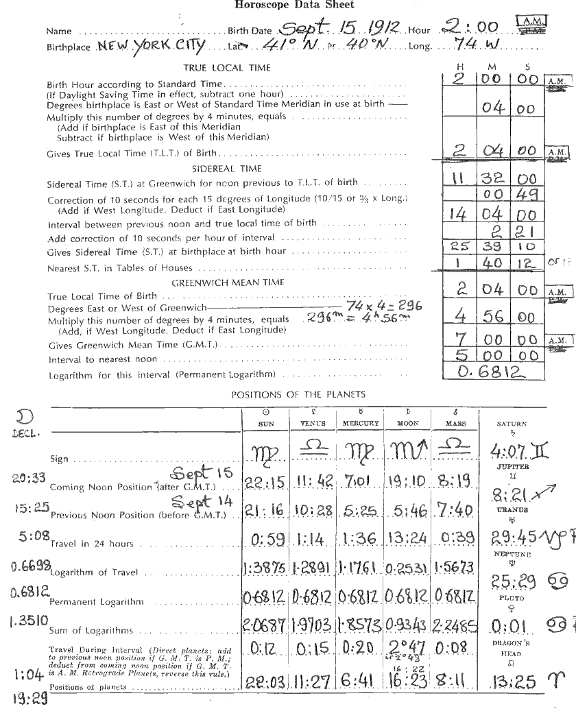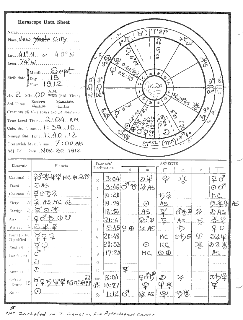 1. In the horoscope for September 15, 1912, which you aspected and indexed in Astrology Independent Study Module No. 20, give a complete delineation of the personality, which depends upon the following factors: