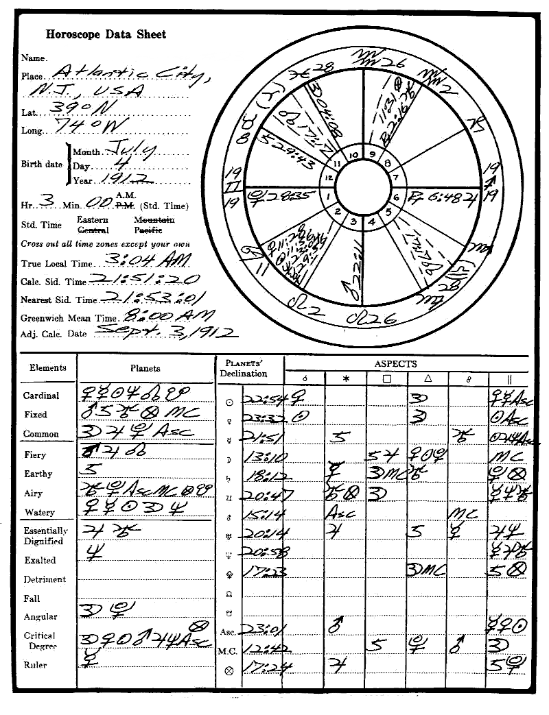 1. When you have studied this Astrology Independent Study Module, please set up the practice horoscope below (Birth Place: Stockton, CA, USA; Lat.: 38 deg. N.; Long.: 121 deg. W.; Birth Date: January 22, 1912; Birth Time: 0:50 A.M.). (Optional)