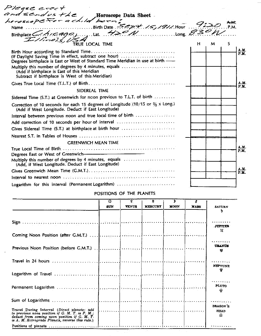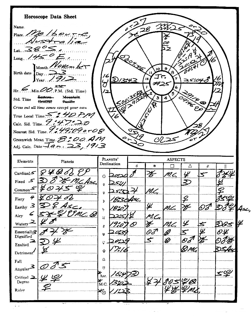 We have 26 additional Astrology Independent Study modules dealing with the esoteric and higher aspects of astrology, which we believe you would find to your advantage to pursue. On this web page you will find data sheet graphics containing the necessary information for the construction of a test horoscope. For this you will require an ephemeris for the year 1911.