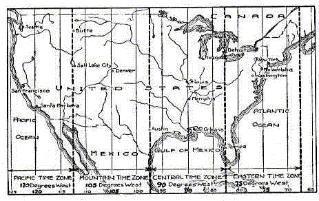 This is accomplished by dividing the earth longitudinally from pole to pole by another set of imaginary circles called Meridians of Longitude, and shown in our chart. All places along such circles have noon at the same instant, regardless of how far they are from the Equator, or whether near the North or South Pole.