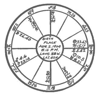 As in the first horoscope we calculated, so in this we may pass Neptune, Uranus, and Saturn without correcting, and enter the longitude of each for the noon nearest G.M.T. in the horoscope. Mars' motion is 15 minutes on the G.M.T. day and his motion during the interval of 9 hours, 45 minutes would therefore be about 6 minutes. Subtracting 6 minutes from Mars' longitude on Aug. 3rd (the noon nearest G.M.T.), Mars' position in the horoscope will be Aries 4:06. Similarly Jupiter requires a correction of 4 minutes making his position Virgo 15.17.