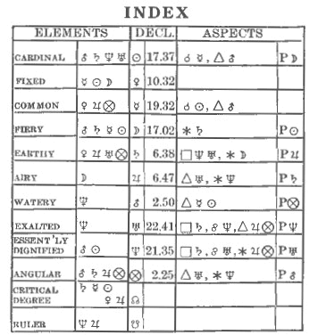 Before we can judge these two horoscopes it is necessary that we should obtain a clear conception of the relations of the planets to one another, to the signs of the Zodiac and to the houses as they are in each of the two horoscopes, and to that end we will make an index that shall reveal these relationships at a glance, so that our minds may not be hampered by mathematics at the time when we are judging the horoscope, but be free and concentrated upon the meaning of the different aspects and positions.