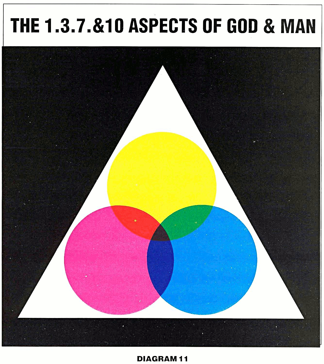 Diagram 6 and Diagram 11 will perhaps make the subject clear. It must be kept in mind that the Worlds and Cosmic Planes are not one above another in space, but that the seven Cosmic Planes interpenetrate each other and all the seven Worlds. They are states of spirit-matter, permeating one another, so that God and the other great Beings who are mentioned are not far away in space. They pervade every part of their own realms and realms of greater density than their own. They are all present in our world and are actually and de facto "nearer than hands and feet." It is a literal truth when we say "in Him we live and move and have our being." For none of us could exist outside these great Intelligences Who pervade and sustain our world with Their Life.