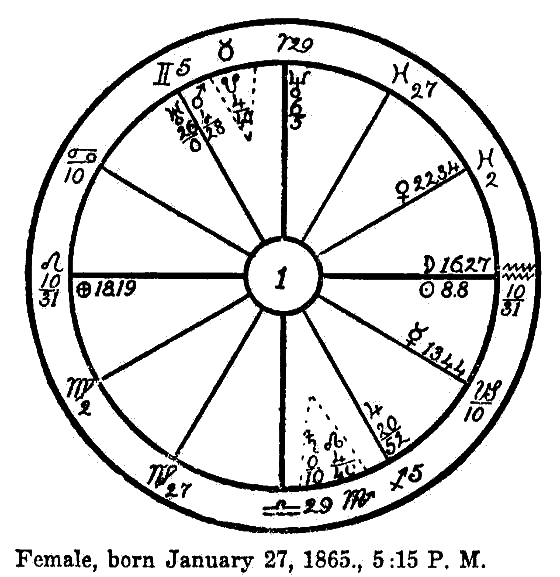 This horoscope is minus the hour of birth, therefore we are using a plain figure with the planets copied from the Ephemeris for noon, Greenwich Mean Time; but from all indications we believe that this woman has the last part of Cancer on the Ascendant.