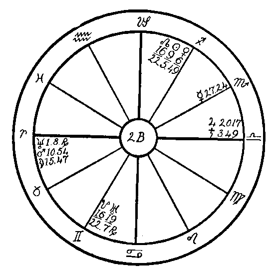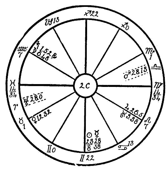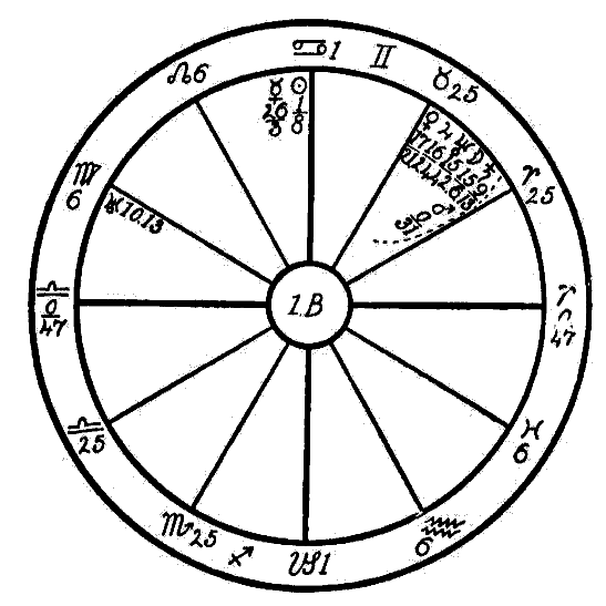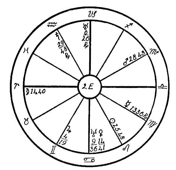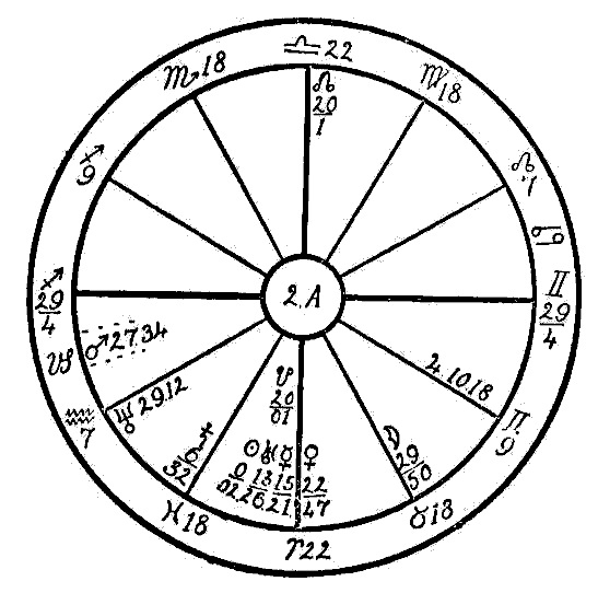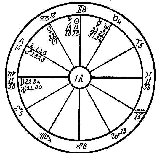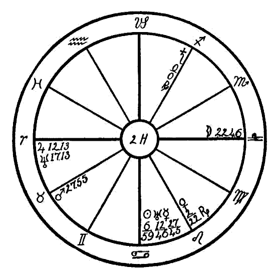 As we have no birth hour, the signs are entered on the houses in numerical order so that Aries occupies the first house, Taurus the second, Gemini the third, etc. and the noon positions of the planets are used just as they are given in the ephemeris.