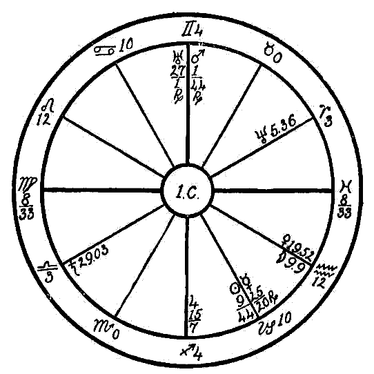 We find that there are common signs on the angles, which is a testimony of a flexible character, difficult to rouse from sickness or trouble into which the native may fall. The Moon in conjunction with Saturn in Aquarius, the sign which governs the ankles and lower parts of the limbs, is evidence of a poor circulation; and Uranus in Leo, the sign of the heart, in opposition to the Moon and Saturn shows that there is a fluttering of that —