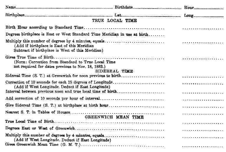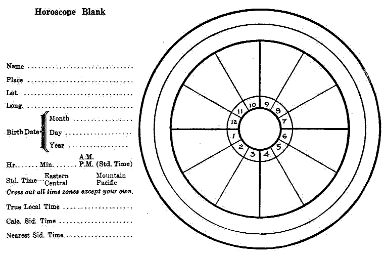This self-study module gives final instructions in the art of erecting a simple horoscope of birth. From such a simple figure one who is proficient may read the very soul of a human being, its hopes, fears, and aspirations, the faults and frailties of its mind and body. Moses was commanded to remove his shoes in front of the burning bush in recognition of the fact that he stood on holy ground illuminated by a Spirit Presence. If all the calcium lights in the world were focused upon an actor, their blinding light would be reflected from his body, but his secrets would still remain within. But when an actor enters upon the stage of life and the starry spotlights are focused upon him through the horoscope, they penetrate to the very soul of his being and lay bare the lines of his life with such clearness that he who can read the stellar script may count the pulse beats of such a one as if they were those of his own soul. Therefore Moses stood on no holier ground than the astrologer who holds in his hand a horoscope; and I feel that I cannot too often reiterate that there is a very grave responsibility connected with this wonderful privilege of the astrologer, and that it behooves him to live a holy life so that he may be worthy to stand in the sublime presence of the Human Spirit as it is revealed in the natal figure. Nor should the student deceive himself; spiritual secrets and the privilege of rendering spiritual help by spiritual interpretation of the message of the stars are not given to one who prostitutes this most sublime science for filthy lucre or uses it for low purposes. God is not mocked; we reap what we sow. If we betray our trust and abuse this great privilege, the day of retribution will dawn sometime and we shall eat the bread of sorrow for our sacrilege. To whom much is given, of him much is required. We pray God that you may live up to the highest possibilities of soul growth by helping others and that the knowledge of astrology which you are now acquiring may prove your most important aid, as it has been and is the greatest blessing in our lives.