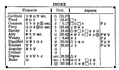 In addition, planets in the last 6 degrees of any sign must be compared with all planets in the first 6 degrees of other signs, because they may be in aspect to each other without coming directly under the preceding rules. For instance, consider Venus and Saturn in the above horoscope. Venus is in the last 6 degrees of Leo, and Saturn is in the first 6 degrees of Gemini. The method is as follows: Add 6 degrees to the position of the planet which is in the last 6 degrees of its sign. Adding 6 degrees to 27-43 Leo, the position of Venus, gives us 3-43 Virgo. Now if the resulting degrees and minutes of Venus equal or exceed those of Saturn and also if the number of signs between Gemini and the new position of Venus, viz. Virgo, falls within one of the classifications in the Table of Aspects, the two planets are in aspect to each other. Applying these tests we find that Venus is square to Saturn. We find also that Uranus is nearly in opposition to Neptune (6 degrees 24'). When one of the planets under consideration is in the Sun or Moon, use 8 degrees instead of 6 wherever 6 occurs above, on account of the orb of the Sun and Moon being 8 degrees. Other examples (not in this horoscope) of cases like the above are as follows: Mars in 24-30 Aries is in conjunction with Venus in 0-30 Taurus; Mercury in 26-0 Taurus is sextile Jupiter in 2-0 Leo; Saturn in 27-0 Gemini is square the Moon in 5-0 Libra; Neptune in 28-0 Cancer is trine the Sun in 6-0 Sagittarius; Venus in 28-30 Leo is in opposition to Mercury in 4-30 Pisces.