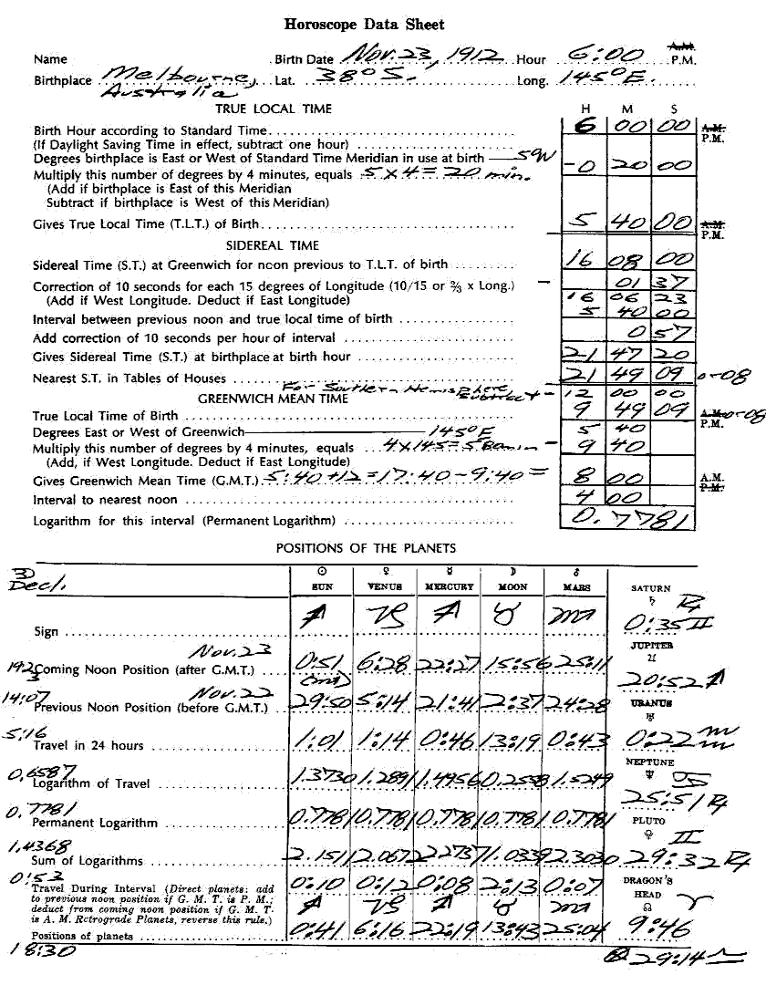 you will find data sheet graphics containing the necessary information for the construction of a test horoscope. For this you will require an ephemeris for the year 1911.