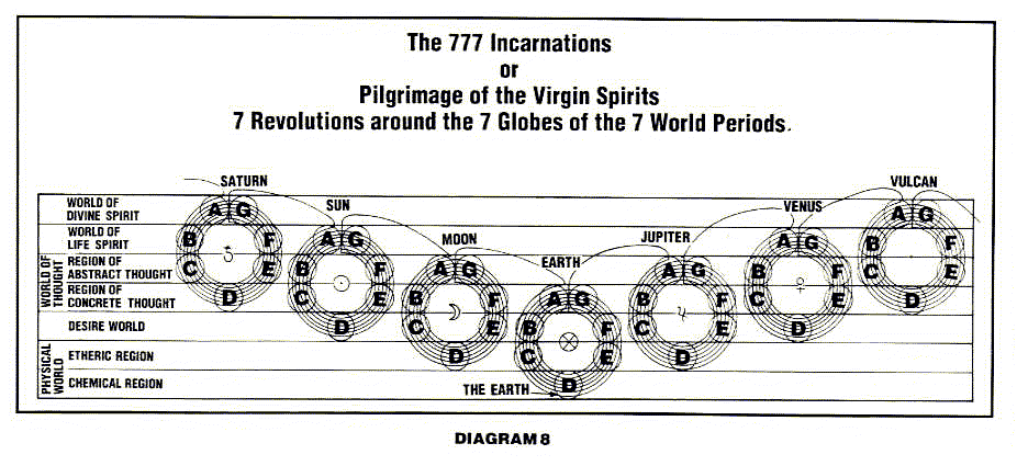 This diagram also shows what are the vehicles of these different orders of Beings, and upon comparison with diagram 8 (in Self-Study Module No. 8), it will be seen that their bodies or vehicles (indicated by squares on diagram 14) correspond to the Globes of the Period in which they were human. This is always the case so far as the ordinary humanities are concerned, for at the end of the Period during which any life wave becomes individualized as human beings, those beings retain bodies corresponding to the Globes on which they have functioned.