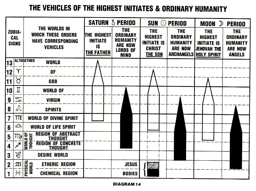 Thus (as shown in Diagram 14) Christ Jesus possessed the twelve vehicles, which formed an unbroken chain from the Physical World to the very Throne of God. Therefore He is the only Being in the Universe in touch with both God and man and capable of mediating between them, because He has, personally and individually, experienced all conditions and knows every limitation incident to physical existence. None save He is able to feel such compassion, nor so fully understand the position and needs of humanity. None save He is qualified to bring the relief that shall fully meet our needs. He took the dense and vital bodies of Jesus that He might function directly in the Physical World and appear as a man among men. Had He appeared in a manifestly miraculous manner, it would have been contrary to the scheme of evolution, because at the end of the Atlantean Epoch humanity had been given freedom to do right or wrong. That they might learn to become self-governing, no coercion whatever could be used. They must know good and evil through experience. Before that time they had been led willingly, but at that time they were given freedom under the different Race religions, each Religion adapted to the needs of its particular Tribe or Nation.
