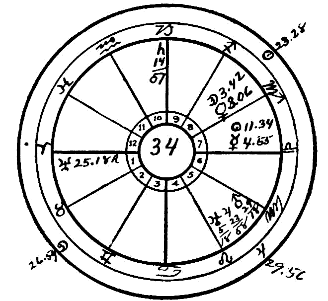 Were it not for good aspects which we have not hitherto mentioned, namely, the sextile of Saturn to Mercury and its trine to the Moon, this person would certainly have become an inmate of an insane asylum, but this is one of the few cases where Saturn really helps in a material sense, for even his good aspects will obstruct when coming to the other planets; but when this obstruction is applied to the Moon, the flightiest planet of all, and to Mercury, the one next to her in swiftness and instability, both of then significators of the mind, Saturn does really help to hold the flighty mind in check, and such a weak mental condition as the one found here will be vastly benefited by these aspects, whereas if there are no evil aspects the sextile of Mercury and Saturn will strengthen the mind in a wonderful degree.