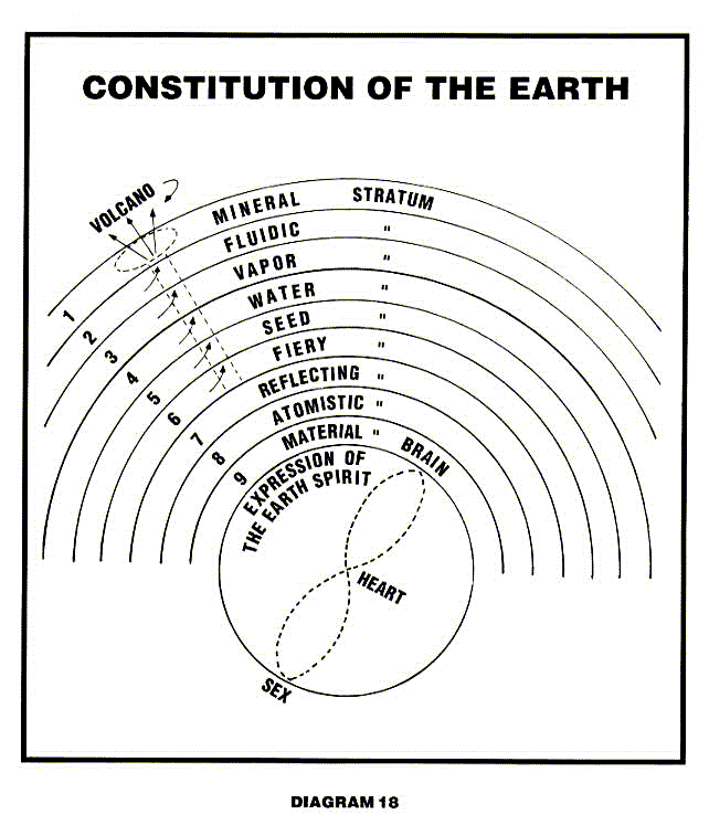 Diagram 18 will give an idea of the arrangement of the Earth's strata, the central core being omitted to indicate more clearly the lemniscate formation of the currents in the ninth stratum. In the diagram the strata are represented as being of equal thickness, thought in reality some are much thinner than other. Beginning at the outside, they appear in the following order: