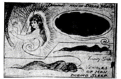 In other stereopticon slides, prepared by early pupils of Max Heindel, the juncture of the sixes is shown just above the head of the sleeping body, almost lying on the pillow, while the desire-stuff segment rises up and is fastened in the great vortex of the desire body which floats like a balloon above the bed, parallel with the sleeping physical body. Of course, the Cord rises up through the head, with the movable seed atoms.
