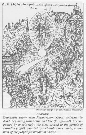 The Eastern Church's Easter picture is not an empty sepulcher. This scene of hope mingled with bewilderment may suggest Resurrection. But where is the Resurrected, the Overcomer? He is resurrecting fallen, indeed, prostrate and sleeping, humanity. He has burst asunder the "brass gates of cruelty"; He has rendered useless the keys to an infernal kingdom; He has made the captor Death captive to His Light; He has taken "our earthy father Adam with him to his glory."